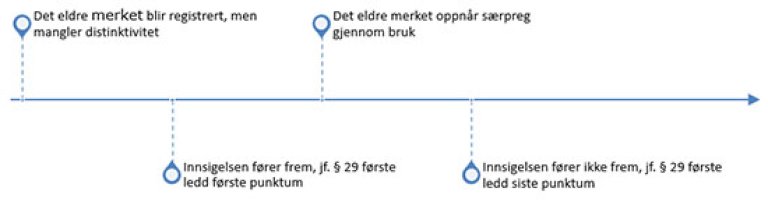 Utgangspunktet for vurderingen av disse vilkårene vil være søknadstidspunktet eller prioritetsdatoen for innehavers varemerke. I slike tilfeller har innehaver bevisbyrden. Dette betyr at det er innehaver som må bevise at innsigerens kjennetegn ikke var et registreringshinder for innehavers varemerke på søknadstidspunktet/fra prioritetsdatoen.